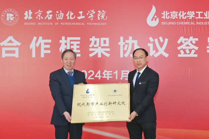 北京石油化工學院黨委常委、副院長陳家慶與北京化工集團黨委常委、副總經(jīng)理韓寶海為“都市化工安全現(xiàn)代產(chǎn)業(yè)學院”授牌